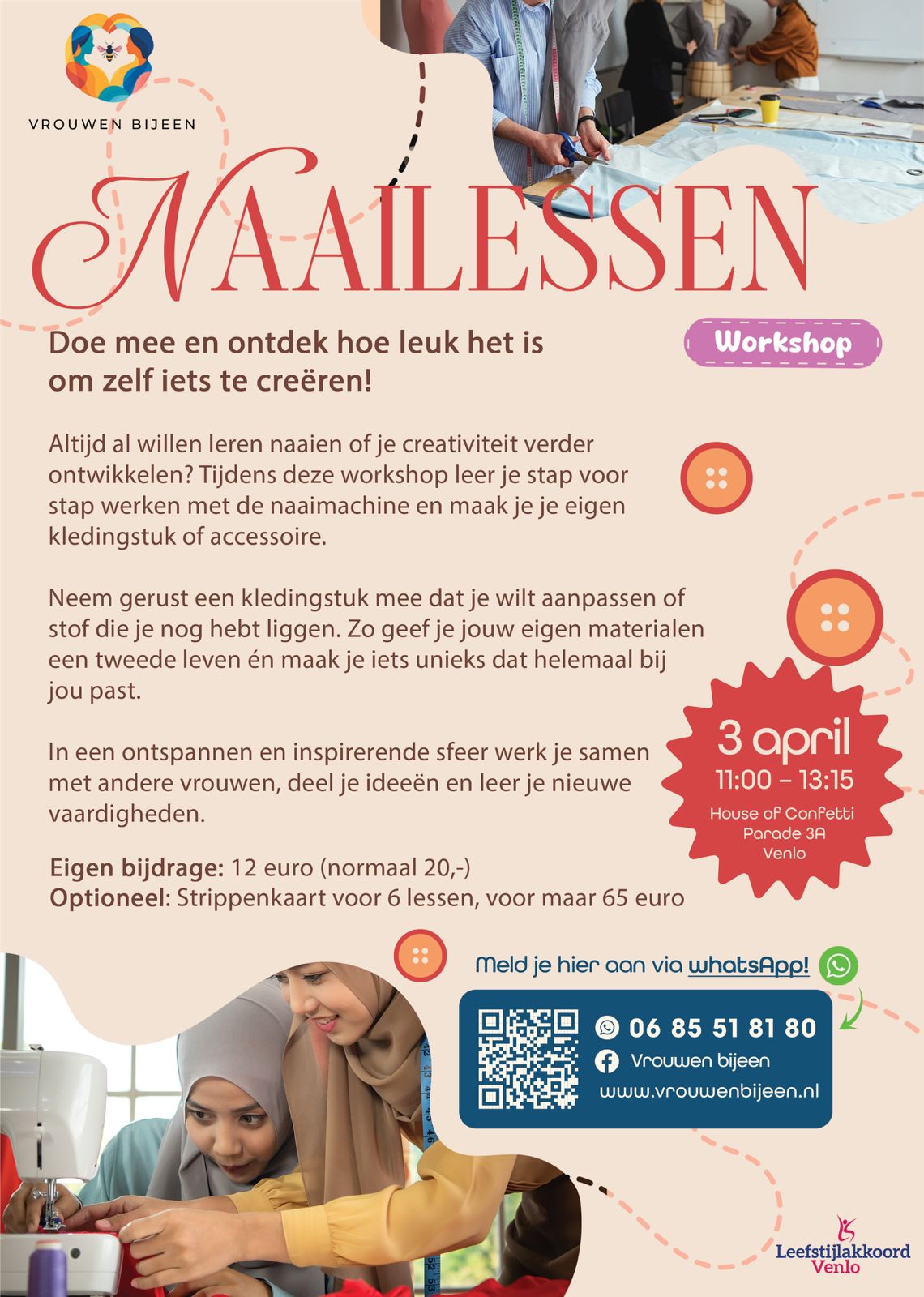 Vanaf 3 april 2026 kun je Naailessen volgen bij Vrouwen Bijeen. Doe mee en ontdek hoe leuk het is om zelf iets te creëren! Meer informatie op https://vrouwenbijeen.nl/project/naailessen/.